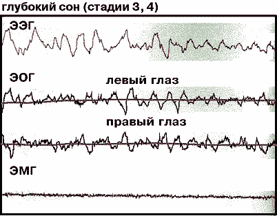 Фрагменты полиграммы на разных стадиях сна. Видно, что для смены стадий медленного сна характерно постепенное увеличение амплитуды и снижение частоты волн ЭЭГ, смена быстрых движений глаз медленными, вплоть до полного исчезновения (ЭОГ регистрируется на фоне ЭЭГ и выделены цветом), прогрессивное уменьшение амплитуды ЭМГ. При парадоксальном сне ЭЭГ такая же, как при бодрствовании, ЭОГ демонстрирует быстрые движения глаз, а ЭМГ почти не регистрируется.
