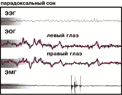Совершенно по-другому обстоит дело с парадоксальным сном, который, в отличие от медленного сна, имеет ярко выраженную активную природу . Парадоксальный сон запускается из четко очерченного центра, расположенного в задней части мозга, в области варолиева моста и продолговатого мозга, а медиаторами служат ацетилхолин, глутаминовая и аспарагиновая кислоты. Во время парадоксального сна клетки мозга чрезвычайно активны, но информация от органов чувств к ним не поступает и не подается на мышечную систему. В этом и заключается парадоксальность этого состояния .